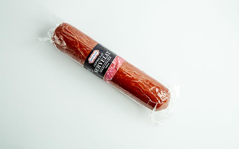 Ingredients: Beef, lard, salt and complex spices. The relative humidity is maintained at a temperature of + 0C to + 6C, provided that it does not exceed 75%, and the sale period is 40 days. Proteins -12.8%, fat content -22.2 g, energy value -257 kcal per 100 g of charge.